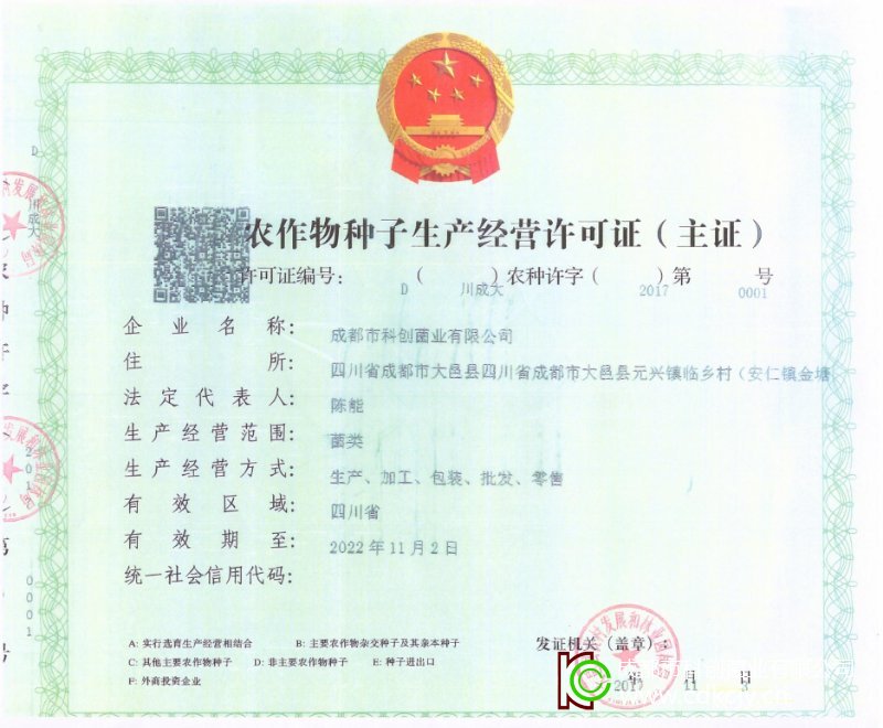 農(nóng)作物種子生產(chǎn)經(jīng)營許可證(主證)